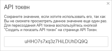 Нажать кнопку Создать и показать API токен. Отобразится информационное окно, содержащие API токен.