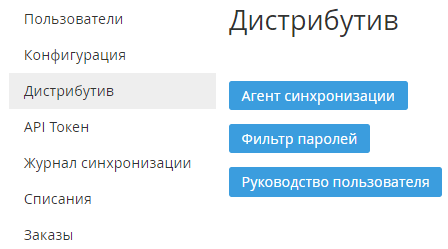 Раздел Дистрибутив содержит ссылки на скачивание файлов установки фильтра паролей (ADPasswordAgent) и агента синхронизации (ADSyncAgent) ADSync.