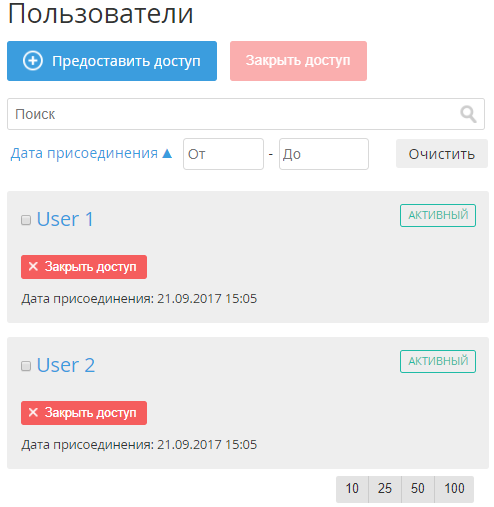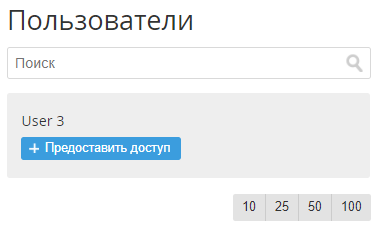 - Нажать кнопку Предоставить доступ в строке с именем Пользователя, которому требуется предоставить доступ к Услуге. Выбранному Пользователю будет предоставлен доступ (см. также Уровни доступа пользователей).