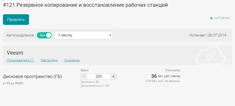Раздел Конфигурация предназначен для управления Подпиской на услугу «Резервное копирование Veeam».