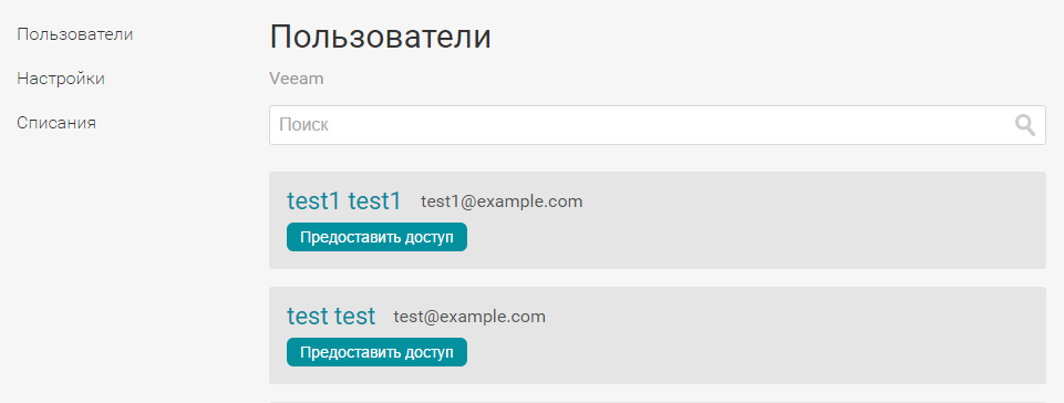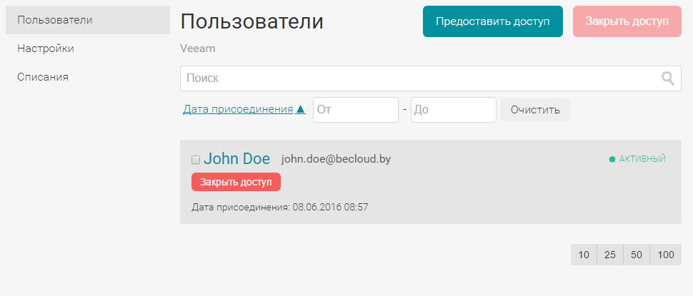 - На экране отобразится список пользователей, которым предоставлен доступ к услуге «Резервное копирование Veeam».