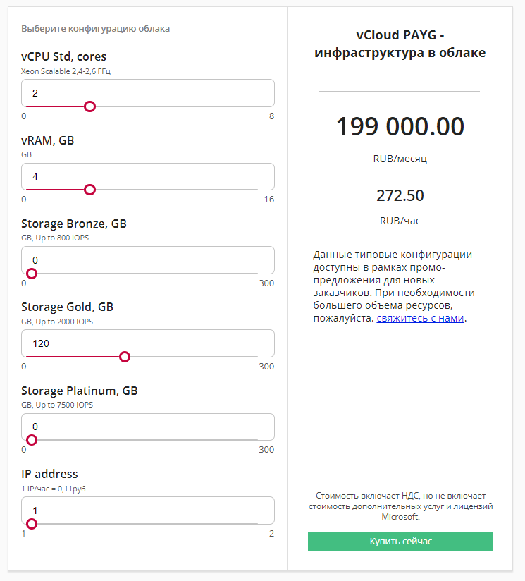 - В группе элементов Выберите конфигурацию облака для каждого требуемого ресурса с помощью ползунка выберите количество, которое планируется потреблять в рамках подписки: