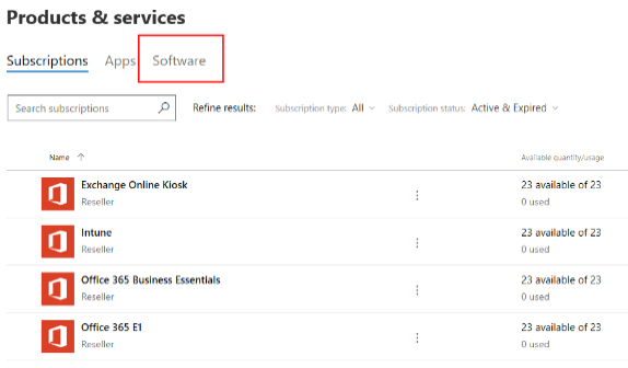 The Subscriptions tab of the Products & Services page is displayed. - Go to the Software tab.