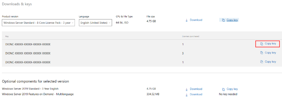 To get the license key of an additional component, click Copy key in the corresponding row of the Optional components for selected version list.