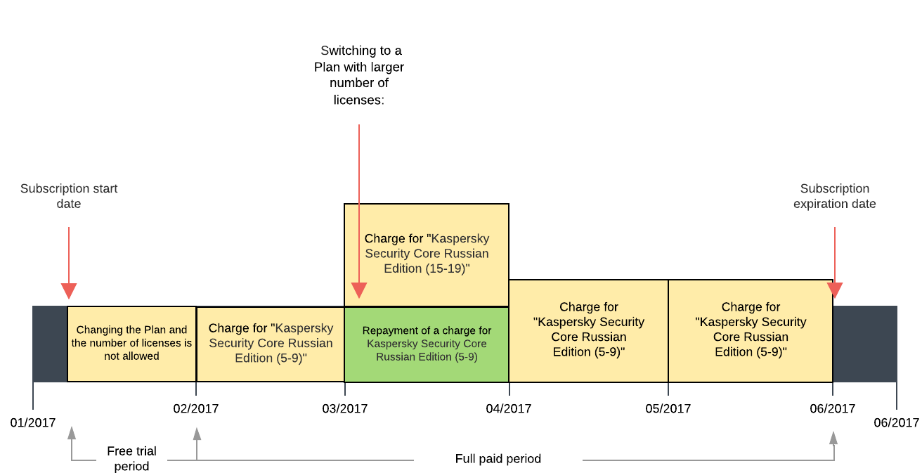 If you change the plan for your Kaspersky subscription within the same "Kaspersky Lab" product, that results only in changing the range of available licenses. In case you switch to a plan with a larger number of licenses, the monthly fee for the previous plan is returned, and you are charged with a fee for the new plan. Regardless of the date, when you change the plan, the billing for the new plan starts from the first day of the current month.