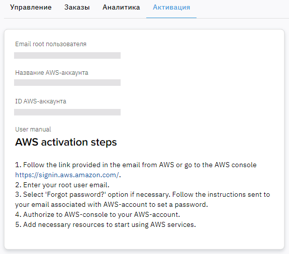 - Email root пользователя — email пользователя root, указанный при заказе подписки. Ссылка на консоль управления AWS отображается в карточке подписки и на вкладке Управление.